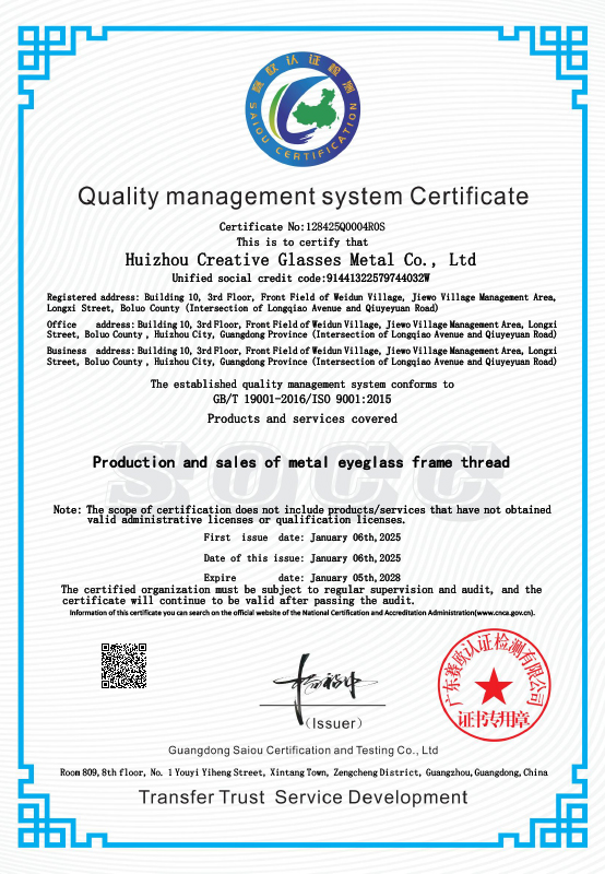 CHOY YEE金属引入全套日本先进机械设备与制造工艺,严选不锈钢、锰料、纯钛、钛合金、Beta - 钛、羽毛钛等优质进口原材料。 可生产异形、花纹、全框、半框、U 形、T 形、方线及品牌logo定制等多形态金属眼镜框线,从源头筑牢产品精良品质。生产环节由专业日本工程师全程监督,训练有素的技术团队严格执行标准化生产与品控流程。此外,从销售对接、技术支持到行政服务,彩意团队始终以专业素养与热忱态度,为客户提供全流程贴心支持,随时响应各类合作需求。